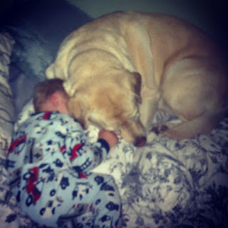 Tristan cuddling with his new "monkey" he got to take home from Grama & Papa's house.